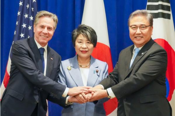 윤석열 대통령을 수행하여 미국 뉴욕을 방문 중인 박진 외교부 장관은 9월 22일 오전 안토니 블링컨(Antony J. Blinken) 미국 국무장관 및 가미카와 요코(上川陽子) 일본 외무대신과 약식 회의를 갖고, 한미일 협력과 역내 정세에 관해 협의했다.