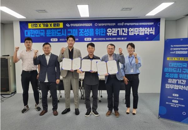 구미시문화도시지원센터는 21일 경북디자인주도제조혁신센터에서 경북창조경제혁신센터, 구미전자정보기술원 일자리창업지원센터와 성공적인 문화도시 조성을 위한 업무협약을 체결했다.