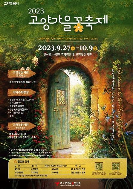 ‘2023 고양가을꽃축제’가 오는 27일부터 10월 9일까지 13일간 일산호수공원 고양꽃전시관과 주제광장 일원에서 열린다. 이번 축제의 메인 주제는 ‘비밀의 화원’으로 실내 공간인 꽃전시관에 1,000㎡의 몰입형 스토리텔링 공간을 조성한다. 또한 고양시에서 생산되는 장미 등 품종별 화훼 작품을 중심으로 화려하고 신비로운 전시가 예정돼 있다.
