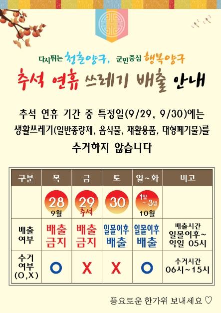 양구군은 추석 당일인 9월 29일과 다음 날인 30일에는 쓰레기를 수거하지 않는다.