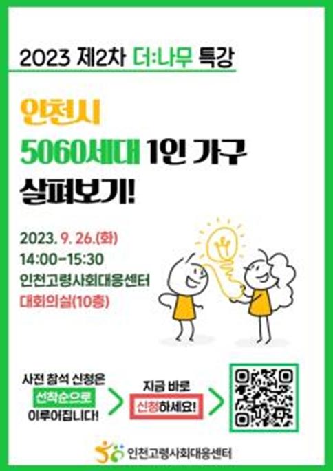 인천시사회서비스원 인천시고령사회대응센터는 ‘5060세대 1인 가구를 살펴보자!’를 주제로 연구 특강 ‘더: 나무(더 나은 삶을 위해 무엇을 알아야 할까)’ 두 번째 시간을 마련한다고 25일 밝혔다. 특강은 오는 26일 오후 2시 고령센터 대회의실에서 열린다.