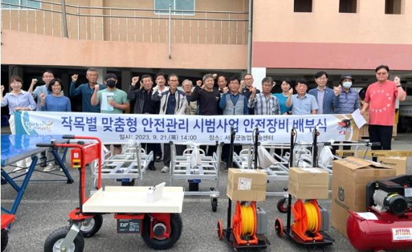 이번 배부식은 ‘2023년 작목별 맞춤형 안전관리 실천 시범사업’의 일환으로, 샤인머스캣 재배 농가의 약제 살포시 부자연스러운 작업 자세, 호흡기 질환 발생 등 전문가의 컨설팅을 통해 분석하고 대책을 강구하고자 마련됐다.