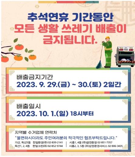 유성훈 금천구청장은 “추석 연휴 기간 중 생활쓰레기 수거 중단으로 주민 여러분께서 불편하시겠지만, 서로 배려하고 모두가 즐거운 명절을 보낼 수 있도록 주민 여러분의 많은 이해와 적극적인 참여를 부탁드린다”라고 말했다.