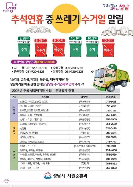연휴가 시작하는 28일과 10월 1일과 2일에는 정상 수거되지만 29일, 30일, 10월 3일은 쓰레기 수거가 되지 않는다.
