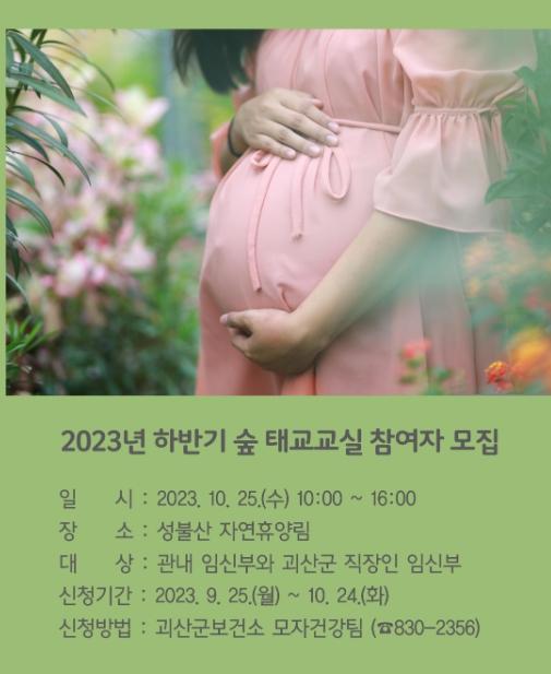 충북 괴산군보건소는 오는 10월 25일 성불산 자연휴양림에서 괴산군에 거주하는 임신부 및 관내 직장인 임신부를 대상으로 ‘숲 태교 교실’을 운영한다.