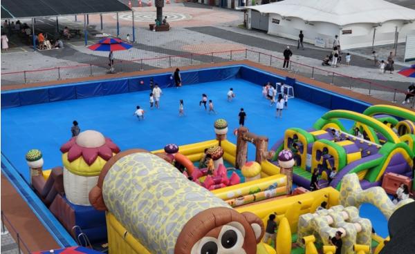 어린이 놀이시설은 야외수영장 성인풀 내에 매트를 설치해 인공암장, 미끄럼틀 등으로 구성된 초대형 에어바운스 4개소와 어린이 축구장 등으로 조성됐다. 또한 안전요원을 곳곳에 배치해 어린이들이 안전하고 즐겁게 뛰어놀 수 있도록 안전관리에 집중, 운영 중이며 누구나 무료로 입장할 수 있다.