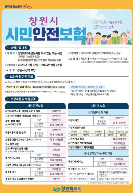 창원특례시는 올해 9월 22일부터 2024년 9월 21일까지 1년간 2023년 창원시 시민안전보험에 가입했다고 밝혔다.