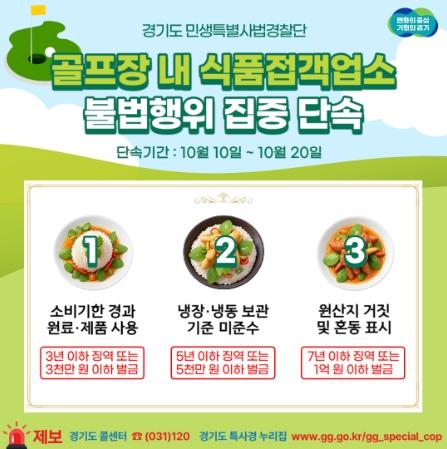 경기도 특별사법경찰단은 10월 10일부터 20일까지 화성시 등 12개 시군 골프장 내 클럽하우스 등 식품접객업소 150곳을 대상으로 불법행위를 집중 단속한다.