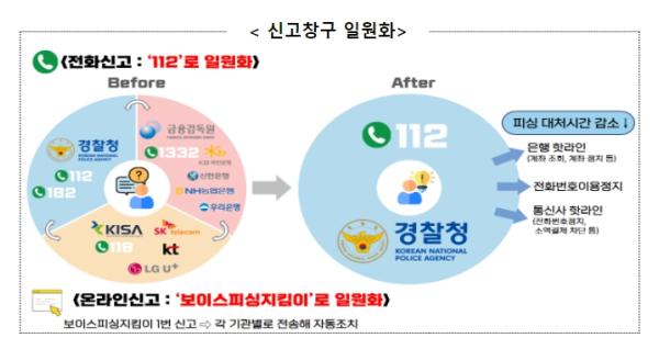 이제, 국민들은 보이스피싱 피해시, ‘112’에 신고하기만 하면 사건접수 뿐만 아니라 악성 앱 차단, 피해구제(지급정지) 등을 한 번에 처리 받을 수 있게 된다.