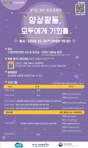 경기도여성가족재단 경기도양성평등센터가 10월 26일 오후 2시 수원컨벤션센터 401호 회의실에서 ‘양성평등, 모두에게 기회를’이라는 주제로 청년 공감 토론회를 개최한다.