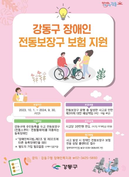 강동구는 올 10월부터 전동보장구(전동휠체어 및 전동스쿠터)를 이용하는 장애인을 대상으로 ‘장애인 전동보장구 보험’ 가입을 지원한다고 밝혔다.