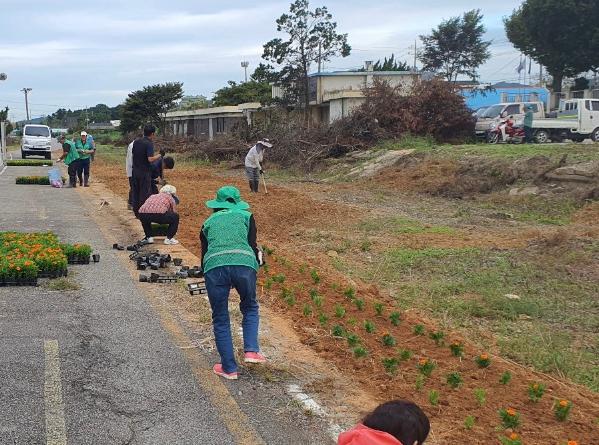 아산시 신창면이 지난 26일 마을 주민 60여 명과 함께 신창역 폐역사 주변에 메리골드 4,000본을 심어 꽃길을 조성했다.