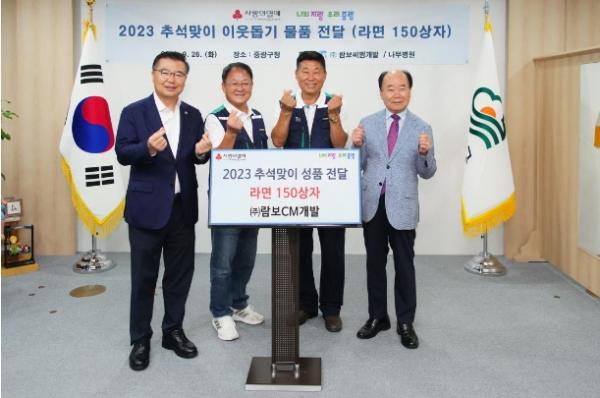 먼저 지난 20일에는 ㈜정호기업이 백미 10kg 1,000포를 전달했고, (사)희망을나누는사람들은 6일과 22일 두 차례, 각 1억 원 상당의 생활용품을 전달했다. 26일에는 ㈜람보CM개발이 지역 내 경로당에 전달해 달라며 라면 133상자를 기부했다.
