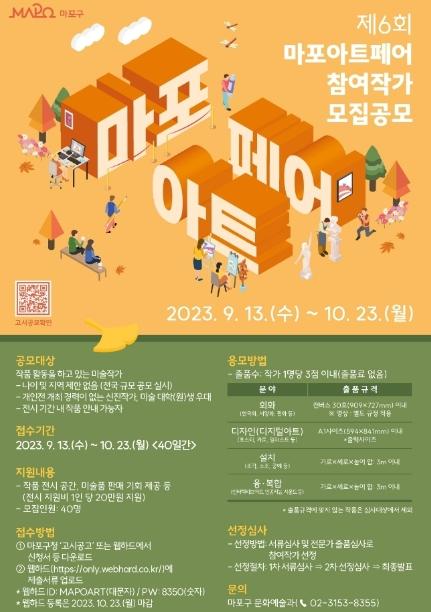 마포구는 오는 10월 23일까지 ‘2023 제6회 마포아트페어’에 참여할 미술작가 40명을 모집한다.