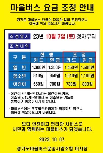 인상된 요금은 7월 12일 소비자정책심의위원회 심의를 거쳐 책정됐다. 인상 요금은 경기도 시내버스 요금에 준하는 카드 기준 ▲일반인은 1,300원에서 1,450원으로 ▲청소년은 910원에서 1,010원으로 ▲어린이는 650원에서 730원으로 오른다.