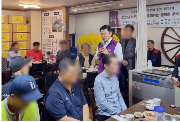 한국자유총연맹 동대문구지회는 26일 오전 11시 30분 추석 명절을 앞두고 청량리동 소재 둥지고시원을 방문하여 거주자에게 점심 식사로 갈비탕을 대접하고 명절맞이 선물을 전달했다.
