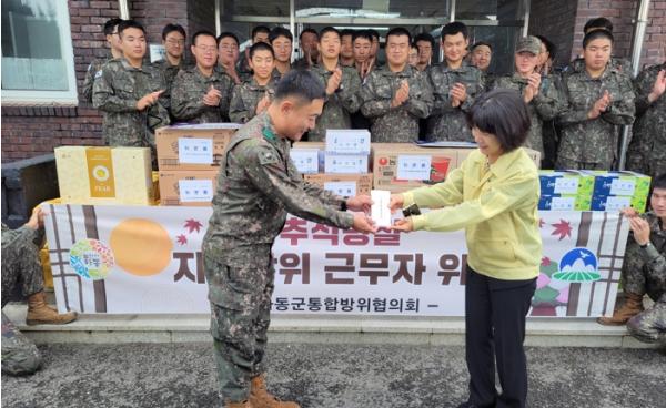 하동군통합방위협의회는 추석 명절을 앞둔 지난 26일 관내 군부대·예비군 지역대 등에서 근무하는 장병·사회복무요원 등 9개 기관 187명에게 돼지고기·배·포도·컵라면·초코파이·떡·상품권 등 1009만원 상당의 위문품을 전달하고 격려했다고 27일 밝혔다.