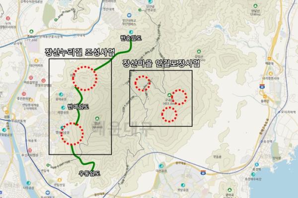 ‘장산누리길 조성사업’은 반송동에서 반여동을 거쳐 우동까지 이어지는 임도(숲길)의 단절구간에 테마가 있는 길을 조성하는 것이다.