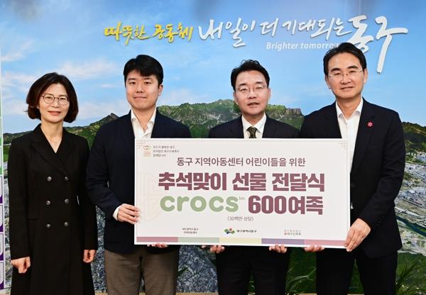 대구 신세계백화점은 지난 26일 동구청을 방문하여, 지역의 취약계층 아이들을 위해 3천만원 상당의 후원물품(크록스 신발)을 기탁했다.