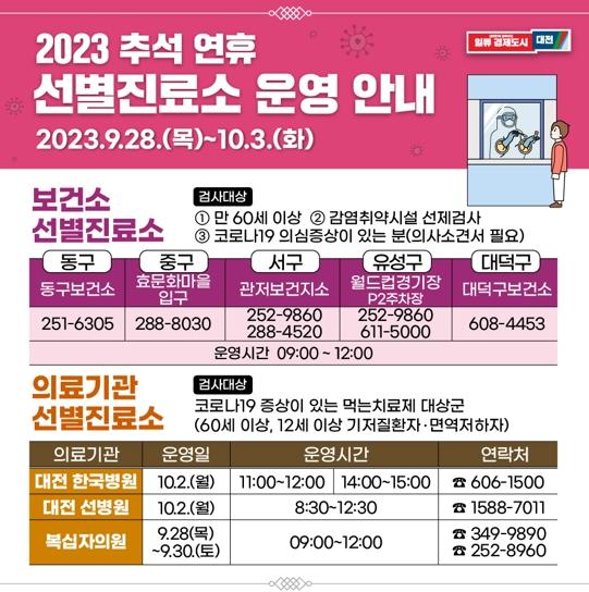 추석 연휴 기간 5개 구 보건소 선별진료소는 매일 오전 9시부터 12시까지 운영한다.