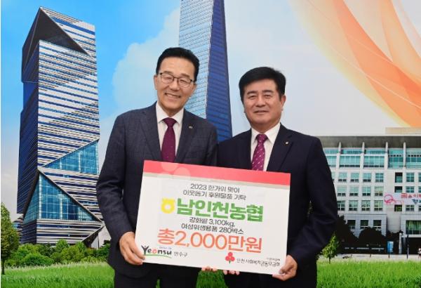 남인천농협은 26일 한가위를 맞아 도움이 필요한 이웃들에게 전달해 달라며, 2천만 원 상당의 후원 물품으로 강화 햅쌀 10kg 310포, 여성 위생용품 280상자를 연수구에 전달했다.