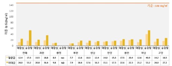 분석 결과 시군별 라돈 평균 농도는 ▲과천(5개 역) 16.5 Bq/㎥ ▲광명(2개 역) 8.9 Bq/㎥ ▲부천(6개 역) 10.6 Bq/㎥ ▲성남(9개 역) 11.5 Bq/㎥ ▲안양(3개 역) 14.6 Bq/㎥ ▲용인(2개 역) 19.0 Bq/㎥ ▲하남(4개 역) 23.9 Bq/㎥ ▲고양(8개 역) 15.4 Bq/㎥ 등으로 나타났다. 이는 모든 지점에서 다중이용시설 실내공기질 권고기준 148 Bq/㎥’ 대비 매우 낮은 안전한 수준이다.