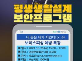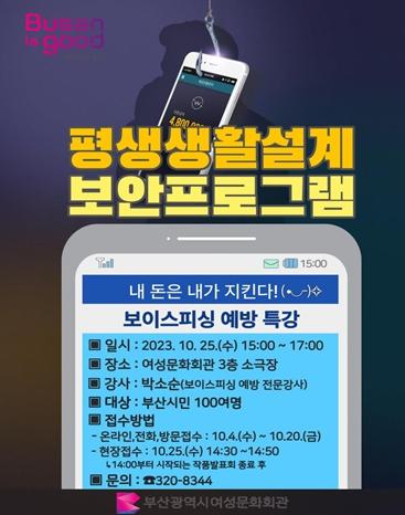 부산시 여성문화회관은 오는 10월 25일 오후 3시부터 5시까지 여성문화회관 3층 소극장에서'2023년 하반기 평생생활설계교육'을 개최한다고 밝혔다.