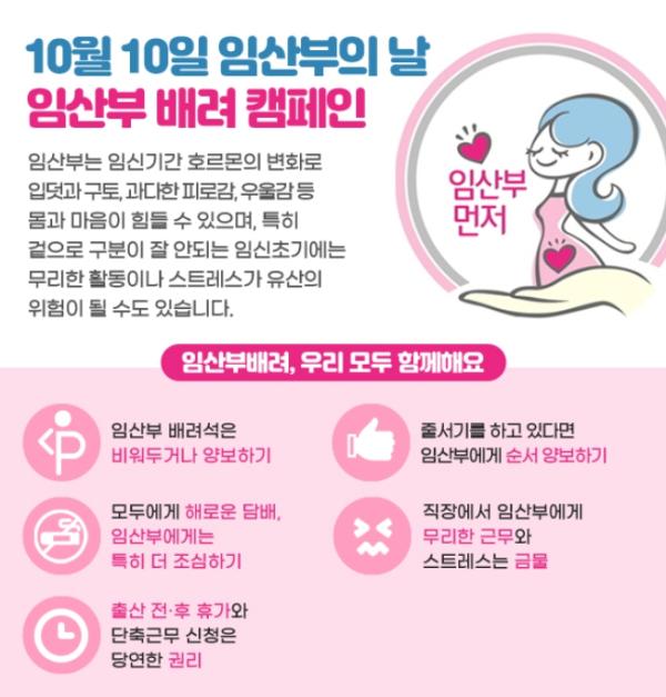 임산부의 날은 임신과 출산을 장려하고, 임산부를 배려하는 사회 분위기를 만들기 위해 2005년 제정됐다. 10월 10일은 풍요와 수확의 달인 10월과 임신기간 10개월을 의미한다.