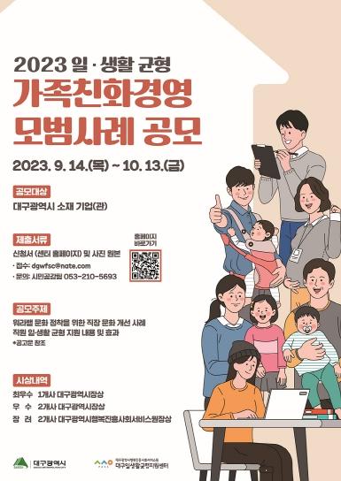 대구광역시는 10월 13일까지 대구지역 일·생활 균형 문화 확산 및 인식개선을 위해 ‘2023년 일·생활 균형 가족친화경영 모범사례’를 공모한다. 이번 공모는 대구지역 기업·기관의 직원들이 일과 생활을 조화롭게 영위할 수 있도록 워라밸(일·생활 균형)을 지원하는 지역 우수기업을 발굴해 포상하고 널리 알려 경쟁력 있는 기업으로 육성하기 위해 실시한다.