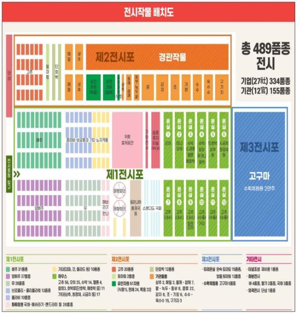 야외에는 ‘품종 전시포’를 조성하여 기업이 개발한 배추, 무, 양배추, 화훼류 등 334품종과 농촌진흥청 등에서 개발한 155품종 등 총 61작물, 489품종의 생육상황을 직접 눈으로 확인할 수 있도록 했다.