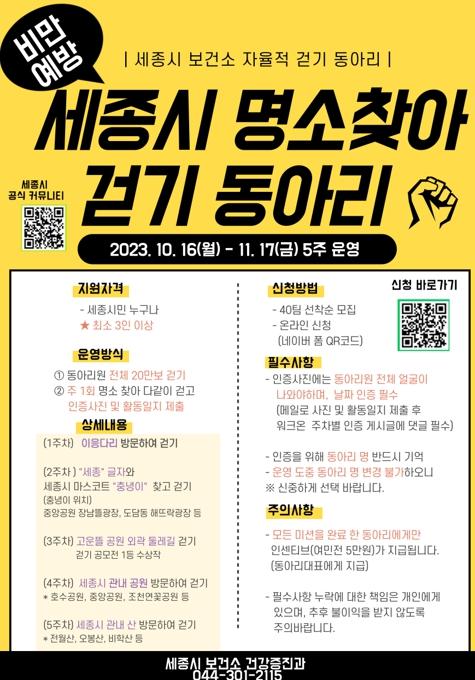 세종특별자치시보건소가 시민의 비만 예방 및 건강증진을 위해 ‘세종 명소 찾아 자율적 걷기 동아리’를 운영하기로 하고, 활동에 참여할 동아리 40팀을 오는 11일까지 선착순 모집한다.