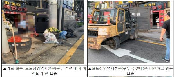 먼저 구는 상인들이 보행로에 방치한 폐박스와 손수레, 자전거 등 적치물을 스스로 정리할 수 있도록 안내했다. 이어 보행에 불편을 주는 보도상영업시설물인 구두 수선대를 보행에 지장이 없는 곳으로 이전했다. 또한 낡은 가로화분 4대를 수거했다.