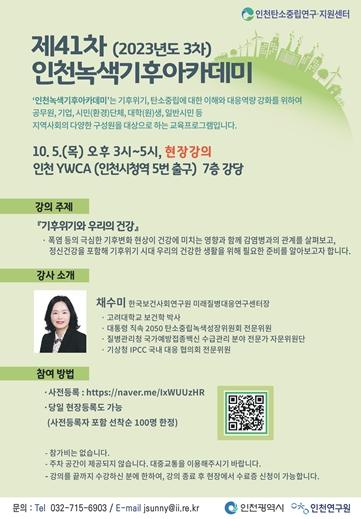 인천연구원 인천탄소중립연구·지원센터는 2023년 10월 5일 오후 3시, 인천YWCA 7층 강당에서 “기후위기와 우리의 건강”이라는 주제로 '제41차 인천녹색기후아카데미'를 개최한다.