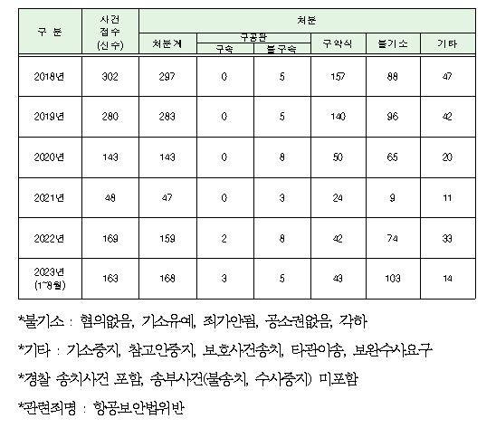 항공보안법 제50조에 따르면 계류 중인 항공기 내에서 흡연은 5백만원 이하, 운항 중인 항공기 내에서 흡연은 1천만원 이하의 벌금 처해질 수 있다. 하지만 모든 기내 흡연행위가 항공보안법 위반으로 처벌받는 것은 아니다. 법무부가 제출한 항공보안법 위반 접수 및 처분 현황에 따르면, 올해 1~8월까지 항공보안법 위반에 따른 처분은 168건만 이루어졌다. 법무부는 항공보안법 위반에 대해 흡연, 음주, 폭언, 폭행 등의 구분 없이 집계하고 있어, 기내 흡연에 대한 대부분이 처벌까지 이루어지지 않고 기내 불법행위 관리 또한 부실한 것으로 나타났다.