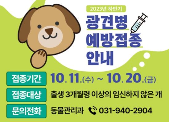 파주시는 반려견을 동반한 야외활동이 많은 가을철을 맞아 10월 11일부터 20일까지 생후 3개월 이상 임신하지 않은 개를 대상으로 광견병 예방접종을 실시한다.