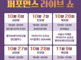 세부 일정은 ▲10월 6일 19시 향촌월드프라자 뒤 공터 ▲10월 7일 19시 로데오타운 ▲10월 26일 12시 만년예술로 ▲10월 27일 19시 향촌월드프라자 뒤 공터 ▲10월 28일 19시 로데오타운 ▲11월 9일 12시 만년예술로 등이다. 자세한 사항은 문화체육과로 문의하면 된다.
