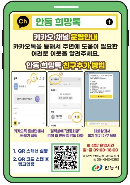 안동시는 위기가구 발굴과 지원 등 빈틈없는 복지안전망 구축을 위해 카카오톡 채널 ‘안동희망톡’을 운영한다.