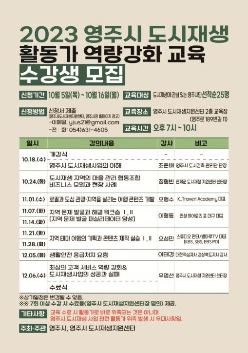 주요 교육내용은 △영주시 도시재생사업의 이해 △ 도시재생 마을관리 협동조합 비즈니스모델과 현장사례 △ 지역문제 발굴과 해결 워크숍 △ 지역 테마 여행의 기획과 콘텐츠 제작 실습 △ 도시재생사업의 성공과 실패 사례 등이다.
