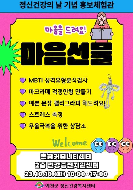 예천군 정신건강복지센터에서 운영하는 체험관에서는 △MBTI 성격유형분석검사 △걱정인형 만들기 △예쁜 문장 캘리그라피 △스트레스 측정 △우울 극복을 위한 상담소 등 다채로운 내용으로 진행한다.