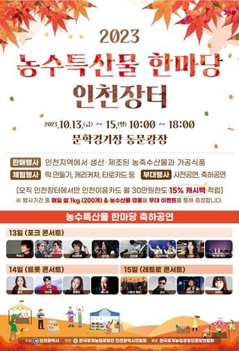 인천광역시는 10월 13일부터 10월 15일까지 3일간 문학경기장 동문 광장에서 ‘2023 농수특산물 한마당 인천장터’를 개최한다고 밝혔다.