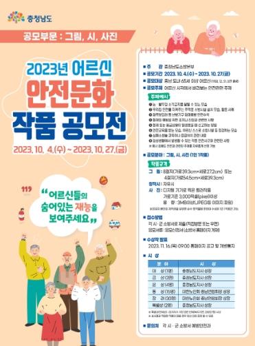 참가는 충남 도내 만 65세 이상 어르신(1958년 12월 31일 이전 출생)이라면 누구나 참여할 수 있으며, 어르신의 시각에서 보는 화재·구조·구급·생활안전이라는 주제로 그림, 창작시, 사진 중 원하는 분야로 참가할 수 있다.