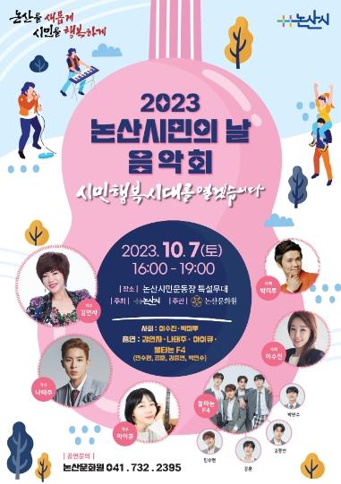 논산시민의 날(매년 10월 1일)을 기념하는 문화예술공연 ‘2023 논산시민의 날 음악회’가 오는 7일 토요일 오후 4시 논산시민운동장에서 막을 올린다.