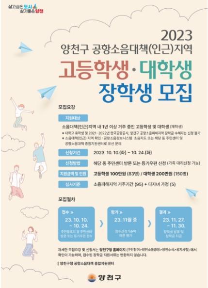 양천구는 항공기 소음으로 학습권 침해를 겪는 소음대책 · 인근지역 거주 학생들의 안정적인 학습환경을 조성하기 위해 ‘공항소음 피해지역 장학생’ 233명을 10월 24일까지 모집하고, 총 3억 8천여만 원의 장학금을 지급할 계획이라고 밝혔다.