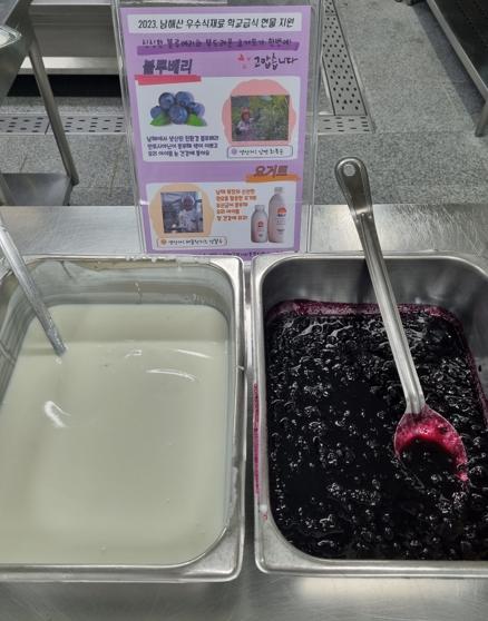 남해군이 관내 학교에 블루베리와 요거트를 급식용 식재료로 공급했다고 밝혔다.