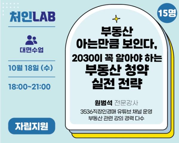 온라인 강의는 6일, 대면 강의는 처인 청년LAB에서 18일 이뤄진다. 교육에서는 주거 관련 전문가가 부동산 관련 기초 상식, 청약, 기초 경매 등에 대해 3시간 동안 안내한다.