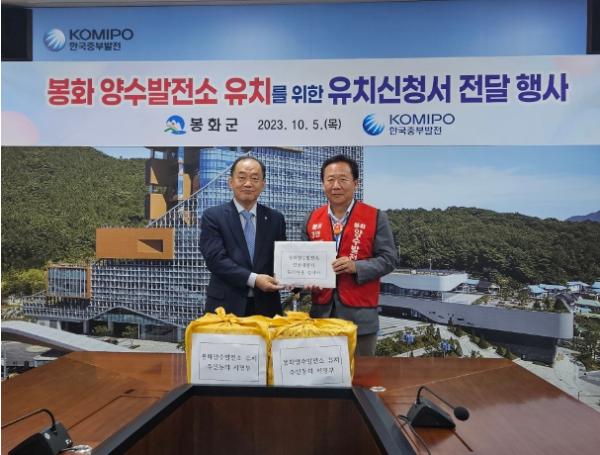 봉화군은 5일 박현국 군수, 김희문 양수발전소 유치위원장, 소천면 두음리, 남회룡리 주민 등 30여 명이 유치 염원을 담은 서명부와 유치신청서를 제출하기 위해 한국중부발전본사에 방문했다.