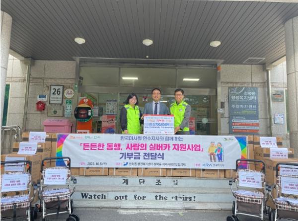 한국마사회 인천연수지사는 5일 지역 내 거동 불편 어르신을 위한 ‘사랑의 실버카 지원 사업’을 지원하기 위해 연수구 청학동 지역사회보장협의체에 후원금 370만 원을 전달했다.