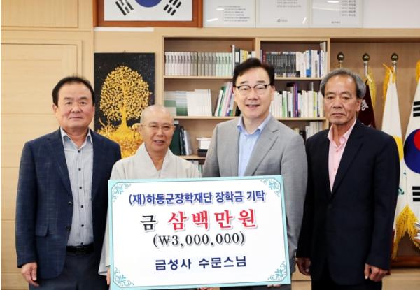 (재)하동군장학재단은 진교면 금성사 수문 주지스님이 지난 5일 군수 집무실을 찾아 지역의 후학 양성에 써달라며 장학기금 300만원을 기탁했다고 6일 밝혔다.