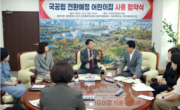 대전 서구는 구청 갑천누리실에서 도안예미지아파트 입주자대표회의, 구슬어린이집, 아이자람어린이집과 어린이집으로 사용 중인 건물 등에 대해 10년간 사용 협약을 체결해 국공립어린이집으로 전환한다고 9일 밝혔다.