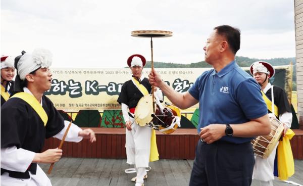 김재욱 칠곡군수는 지난 8일 가산면 학상리에서 열린‘학수고대 축제’에 참석해 버나를 돌리고 마을 주민과 어울려 대동놀이를 펼쳐 눈길을 끌었다.